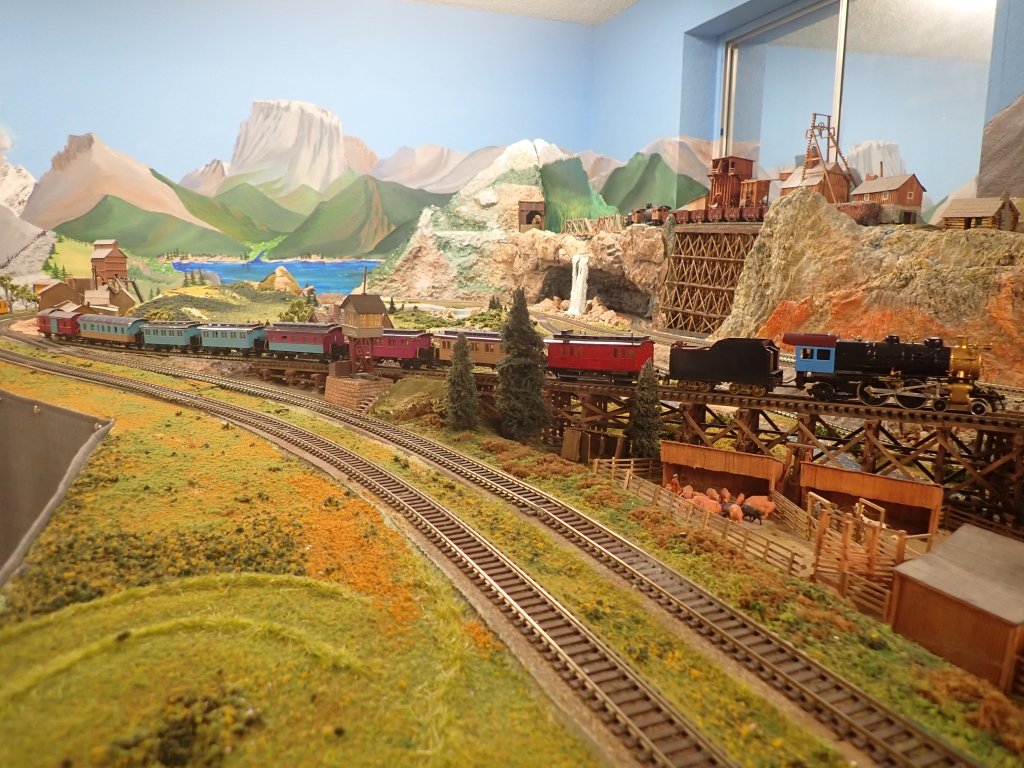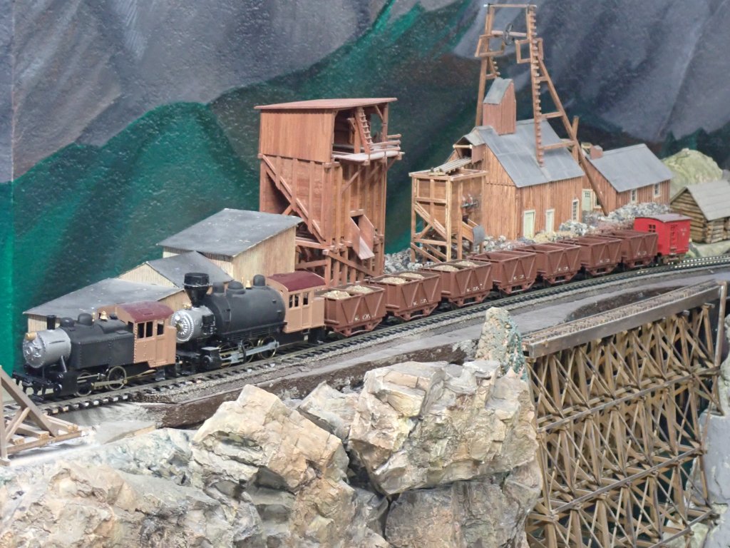 My locomotives and Don’s ore cars load up at Knottjeur’s Ore Mine. Don also built the structures and the wonderful trestle. It took some doing to build a scene around it!
