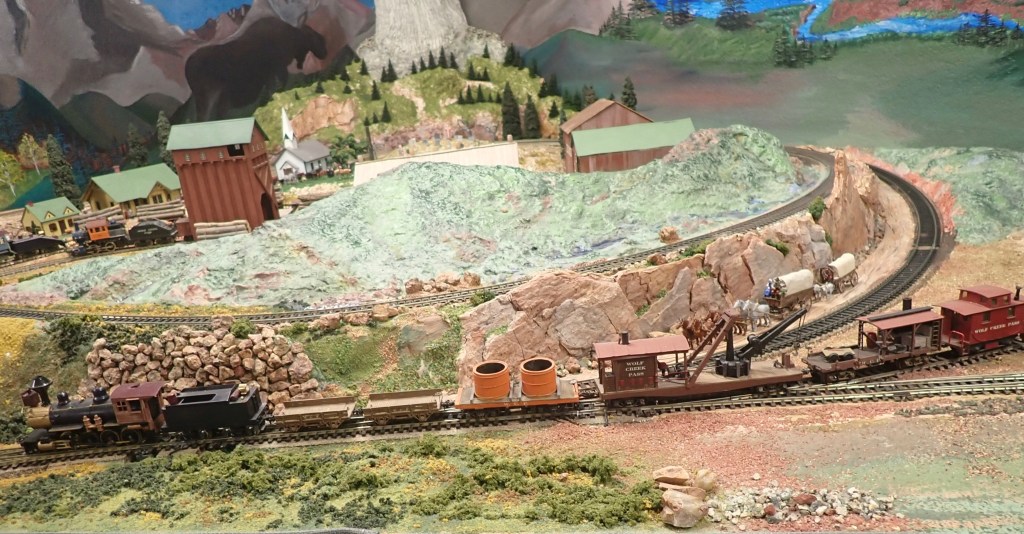 On the banks of Horse Creek, sawmill and lumber trains are ready to go! Except for the locomotive on the left, the trains and structures were all built by Don Fouse.
